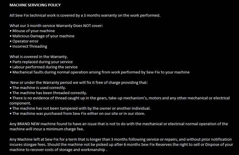 Repairs and service on all domestic sewing machines . All with 3 month warranty* and free pick up & delivery in melbourne metro. *Overlockers / Coverstitch service $190